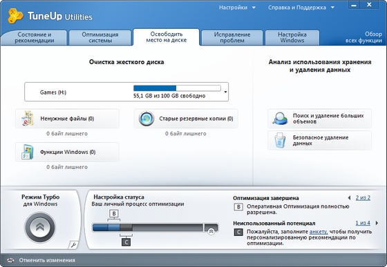 TuneUp Utilities предлагают Вам два новых метода оптимизации, которые гарантируют оптимальную работоспособность даже при высокой загруженности компьютера. В случае необходимости, быстродействие будет увеличено или ускорится процесс запуска программы.