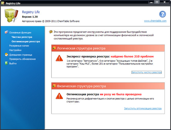 • Для ликвидации первой причины замедления компьютера Registry Life предлагает удобный инструмент для очистки и исправления реестра. С его помощью можно провести проверку реестра на наличие более 10 категорий различных проблем. Одновременно с этим программа проведет удаление информационного мусора из реестра.