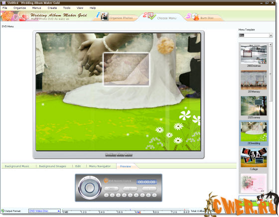 Wedding Album Maker Gold – это профессиональная программа фотоальбома, которая создает впечатляющее слайд шоу из свадебных фотографий с музыкой, переходами и DVD меню. Данная программа позволяет быстро и легко создать впечатляющие свадебные альбомы на DVD видео диски, чтобы поделиться своей историей любви по свадьбе с другими людьми. Новая версия поддерживает больше выводных форматов, такие как: MPEGI, MPEGII, MPEG-4, MP4 for iPod, PSP, 3GP сотовые телефоны, FLV , XVid AVI, AVI, видео форматы для Anrchos, Creative Zen Vision, iRiver PMP 100, YouTube, MySpace.