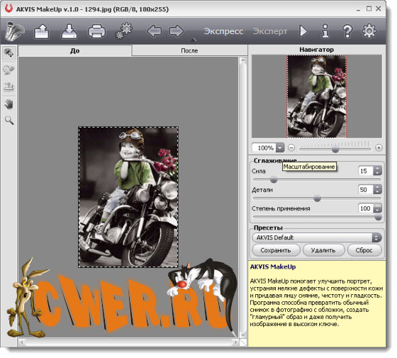 Программа улучшает и омолаживает кожу, не изменяя при этом других важных компонентов фотографии, оставляя выразительными глаза и волосы, не затрагивая фон.