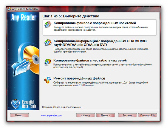 Часто необходимо считать данные с поврежденных "флешэк", дискет, поцарапанных DVD/CD-дисков, ненадежных сетей LAN (Wi-Fi). Обычными средствами это будет сделать, скорее всего, невозможно. Для таких случаев и существует программа AnyReader, которая выручит вас в подобной ситуации и легко прочитает, казалось бы, уже потерянную ценную информацию с любых носителей, которые доступны как буква диска в операционной системе Windows. Продолжение чтения (копирования) данных после возникающих ошибок или потери соединения в сети является уникальной возможностью программы AnyReader.