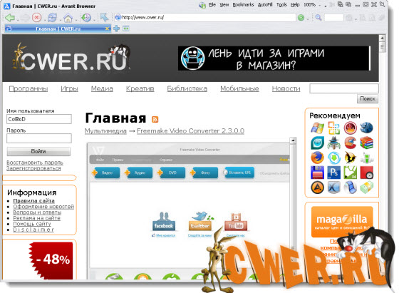 Avant Browser - браузер на основе Internet Explorer для расширения опций браузера и повышения комфортности интернет-серфинга, с отображением всех открытых веб-страниц в одном многовкладочном окне, автозакрытием рекламных окон, быстрым отключением / включением загрузки графики, удобным удалением временных интернет-файлов, интеграцией с поисковиком Google, скинами и сменными кнопками, подключением средней кнопки мыши, управлением мышью и т.д. Интерфейс меняется скинами (с домашней страницы можно скачать программку для создания своих собственных скинов).