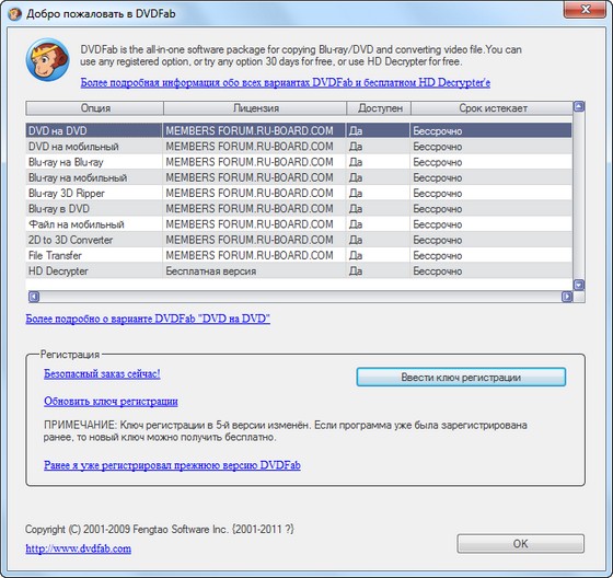 DVDFab – мощный, многофункциональный программный продукт для копирования DVD дисков с возможностями гибкой обработки видеопотока. Программа является одной из лучших на сегодняшний день, из инструментов для копирования, разбиения, пережатия и конвертирования DVD дисков с фильмами. Снимает все защиты и ограничения с диска и при желании пережмет диск большой емкости и вместит его в обыкновенную пустую DVD болванку с минимальными потерями качества (DVD9->DVD5) или разобьет фильм на два диска с полным переносом его меню, удалит всю рекламу, запишет только фильм и многое другое. Программа имеет интуитивно понятный, мультиязычный интерфейс включая русский.