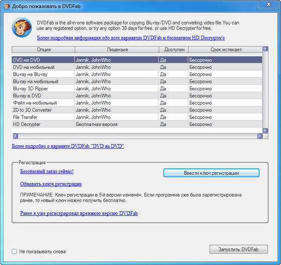 DVDFab – мощный, многофункциональный программный продукт для копирования DVD дисков с возможностями гибкой обработки видеопотока. Программа является одной из лучших на сегодняшний день, из инструментов для копирования, разбиения, пережатия и конвертирования DVD дисков с фильмами. Снимает все защиты и ограничения с диска и при желании пережмет диск большой емкости и вместит его в обыкновенную пустую DVD болванку с минимальными потерями качества (DVD9->DVD5) или разобьет фильм на два диска с полным переносом его меню, удалит всю рекламу, запишет только фильм и многое другое. Программа имеет интуитивно понятный, мультиязычный интерфейс включая русский.