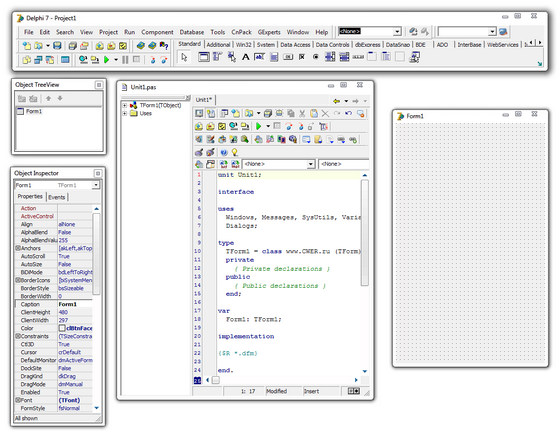 Существует четыре варианта пакета Borland Delphi 7 Studio: Personal, Professional, Enterprise и Architect. Каждый из этих комплектов включает стандартный набор средств, обеспечивающих разработку высокоэффективных программ различного назначения, в том числе для работы с базами данных. Вместе с тем, чем выше уровень комплекта (от Personal до Architect), тем большие возможности он предоставляет программисту. Так, комплект Enterprise позволяет разрабатывать приложения работы с удаленными базами данных (например, InterBase), а комплект Personal — нет.