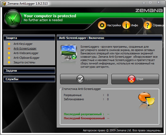 Zemana AntiLogger - мощный программный комплекс для защиты вашего ПК от наиболее опасных сетевых угроз, таких как KeyLoggers, ScreenLoggers, WebCamLoggers, ClipboardLoggers. Помимо обеспечения безопасности от вышеуказанных вредоносных программ, программа защищает доверенные компоненты системы от нежелательного доступа, например, инжекция dll/code, загрузка драйвера ядра, изменение физической памяти и т.д. Программа совместима со всеми популярными антивирусами и совершенно не влияет на производительность системы.