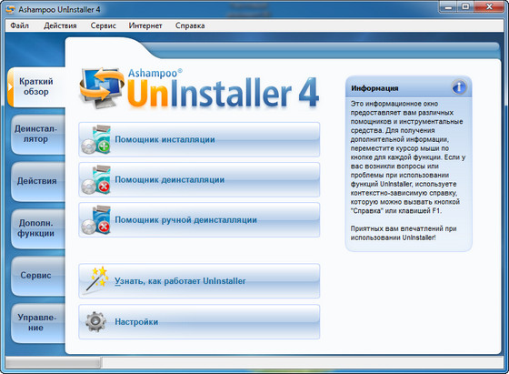 Ashampoo UnInstaller - деинсталлятор программ с прекрасно организованным интерфейсом и алгоритмом работы. Эта утилита отслеживает и регистрирует изменения, которые вносят инсталляционные программы, что позволяет при необходимости корректно удалить ненужную программу. Положительным качеством является то, что данная программа удаляет не только те приложения, что были отслежены ей, но и путем анализа деинсталлирует программы, мониторинг которых не производился. Кроме своей основной функции, программа способна удалять дубликаты и временные файлы, управлять установленными в систему шрифтами. Имеет стильный пользовательский интерфейс с мультиязычной поддержкой, включая русский язык.