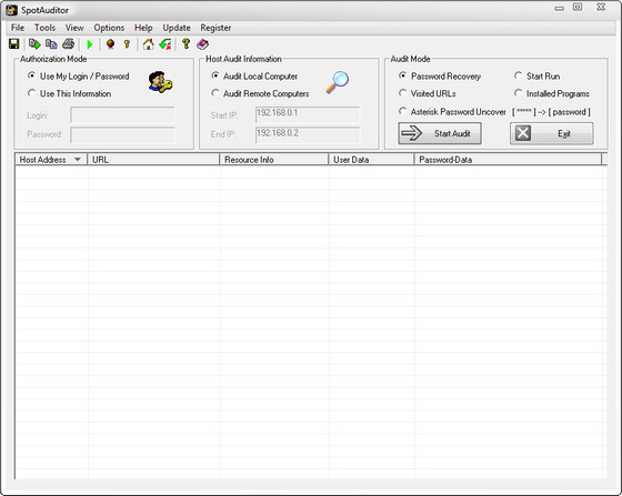 SpotAuditor восстанавливает все Ваши пароли, изъятые из Internet Explorer, ICQ, Far ftp-клиент, SecureFX ftp-клиент, Dial Up, Outlook и MSN messenger, IE Auto Complete Fields. Продукт создан специально для того, чтобы просмотреть и очистить Ваши секретные данные, которые зачастую доступны другим пользователям. Программа также исследует запущенные приложения, посещенные URL, установленные программы, которыми можно управлять на Вашей машине или по сети, если не запрещен доступ.
