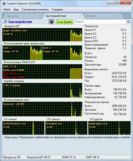 Не пропустит System Explorer и процессы, использующие сеть. Из раздела "система" можно деинсталлировать переставшую быть нужной программу, изменить параметры автозапуска ОС, просмотреть драйвера устройств. В общем, если вас не устраивает стандартный диспетчер задач, попробуйте System Explorer.
