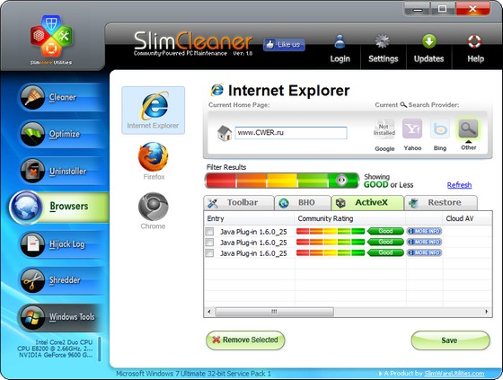 В комплект SlimCleaner входят утилита для деинсталляции приложений и «шредер» для безопасного уничтожения файлов, папок и т.д. Есть возможность анализировать содержимое меню автозагрузки и взаимодействовать с активными службами, а также генерировать журнал Hijack Log, подробного списка всех инструментальных панелей, браузерных «помощников», плагинов ActiveX и других объектов второстепенной важности, установленных в системе. С помощью предлагаемых инструментов пользователи смогут добиться максимально производительной работы системы.