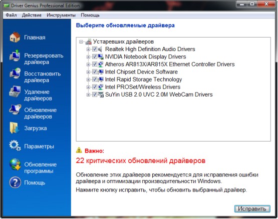 Driver Genius Professional - программа для управления драйверами (создания резервных копий, восстановления поврежденных версий, обновления и удаления ненужных), имеющая также некоторые возможности для диагностики аппаратного обеспечения. Driver Genius позволяет в автоматическом режиме найти необходимые драйверы для всех устройств, используя данные об установленных в систему устройствах. Поддерживается работа с более чем 30 тысячами различных материнских плат, видеокарт, звуковых и сетевых карт, модемов, мониторов, клавиатур, мышей, видеокамер и т.д. База программы постоянно обновляется.