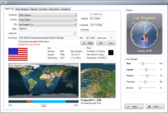 Выбирайте из множества форматов даты и времени, которые вы сможете применить индивидуально для каждых часов. Поддерживается карта мира с временными зонами, с возможностью просмотра областей Земли, где день или ночь, положение солнца, восходы и закаты солнца, расчет лунных фаз. Синхронизация времени с атомными часами и серверами точного времени через Интернет.