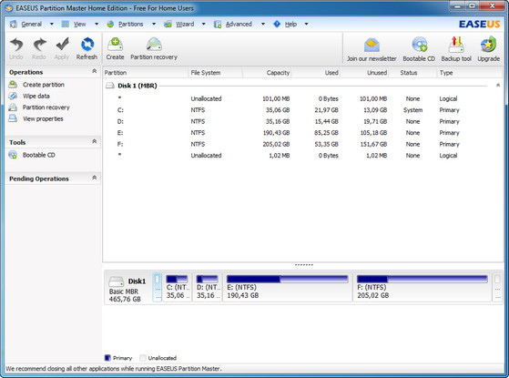 EASEUS Partition Master — удобная программа для разбиения жёсткого диска на разделы, которая не только упростит рутинные задачи, но и поможет вам редактировать разделы диска и управлять ими. А именно — быстро и с лёгкостью создавать, удалять и форматировать разделы, изменяя их размер и расположение без потери данных, с использованием свободного места на диске. С помощью этой программы, вы можете создавать, удалять, форматировать разделы на вашем жестком диске быстро и просто. К наиболее привлекательной функции относится способность изменения размера/перемещение ваших разделов, используя свободное место, без удаления данных.