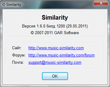 Similarity - программа предназначена для сравнения и поиска дубликатов музыкальных файлов (MP3,WMA,ASF,WAV). Анализ производится по содержимому файла, стоит отметить что проверяется именно схожесть звуковой части, используя различные алгоритмы FFT, Wavelet, мат.статистику, т.е. никакого побитового сравнения не производится, поэтому программе необходимо декодировать музыкальный файл. Также программа может сравнивать по значениям ID3, ASF тэгов и имен файлов. Особенностью программы является, то что она подсчитывает некую оценку файла и не требует постоянного присутствия носителя с файлом, другими словами файлы для анализа можно указывать на временных носителях CD-ROM, DVD-ROM, flash, они все равно будут участвовать в сравнении корректно.