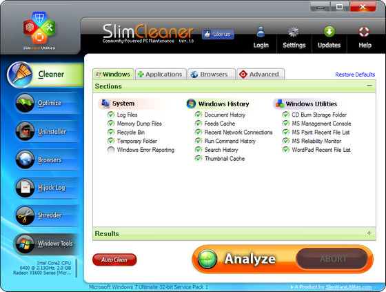 SlimCleaner - программа для очистки и оптимизации работы системы. Основной особенностью утилиты является поддержка пользовательских рейтингов в инструментах оптимизации системы и удаления программ, которые гарантируют быструю и точную оценку любого распространенного приложения (медиапроигрывателя, офисного приложения, браузера и антивирусного ПО). Приложение чистит систему от файлового мусора, временных файлах Windows, списках недавно открытых документов и других ненужных объектах. Также чистка проводится в папках, используемых Windows-приложениями для хранения собственных журналов истории.