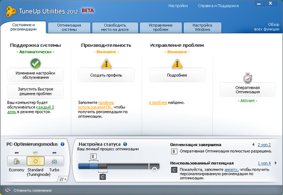 TuneUp Utilities предлагают Вам два новых метода оптимизации, которые гарантируют оптимальную работоспособность даже при высокой загруженности компьютера. В случае необходимости, быстродействие будет увеличено или ускорится процесс запуска программы.