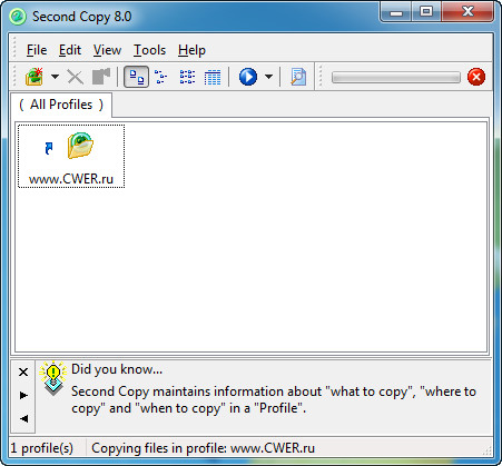 Second Copy позволяет создавать «вторые копии» важных пользовательских файлов или, говоря иначе, осуществляет резервное копирование. Программа допускает создание нескольких профилей/задач, а также автоматизацию их запуска с помощью планировщика.