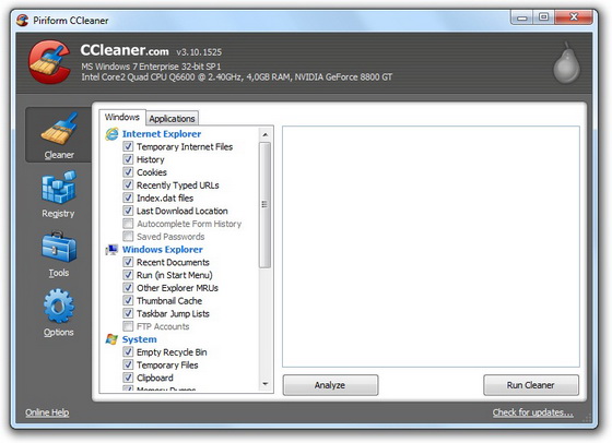 - Added cleaning for MS Search, Cached Fonts, RegEditX, SpeedBit DAP, Spyware Terminator, SUPERAntiSpyware, Acrobat Distiller 10 and Foxit Reader 5.0.