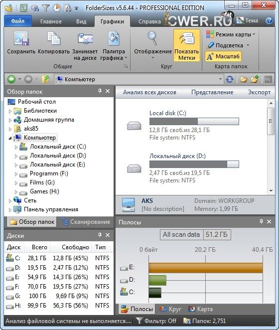 Эта программа позволит вам провести проверку жестких дисков на наличие на них свободного места. Если вы никак не можете понять, почему места осталось так мало, запустите FolderSizes Pro, и программа создаст для вас полный отчет. Программа сгенерирует диаграммы, которые наглядно покажут, какие папки занимают больше всего места. Среди возможностей программы: Распечатка отчетов, экспорт их в HTML; Экспорт диаграмм в файлы JPEG, PNG, BMP или TIFF; Система создания отчетов по типам файлов, которые занимают больше всего места.