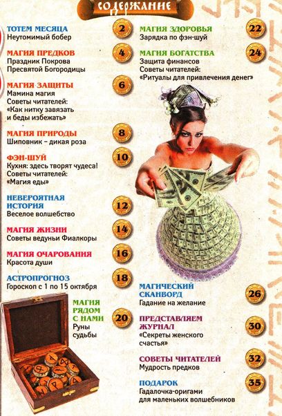 Журнал магических советов, основанных на старинных поверьях и приметах, народной мудрости. Все советы применимы в обычной жизни, помогают предотвратить болезни и укрепить здоровье без лекарств, обрести и не потерять настоящую любовь, привлечь счастье и удачу, увеличить доходы, наполнить дом положительной энергией и защитить себя и близких. В каждом номере вас ждет подарок – талисман, амулет или оберег.
