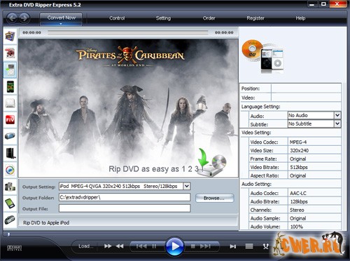 Extra DVD Ripper Express - гибкое и удобное программное обеспечение, способное проворно перекодировать dvd видео в DivX, XviD, avi, VCD, SVCD, iPhone, flv (YouTube), mpeg, iPod (MP4), Sony PS3, Sony PSP, WMV, Pocket PC, MP4, 3gp без утраты качества. В дополнение утилита обладает функцией проигрывания видео во время риппинга DVD. У программы отличная скорость работы, в итоге видео файлы превосходного качества, большое количество настроек обещают предсказуемость результата