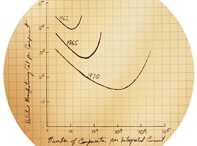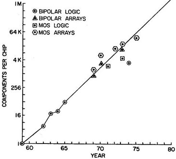 Но главное — в течение 60-х гг. улучшения литографии позволяли увеличивать число транзисторов экспоненциальными темпами. Это заметил химик Гордон Мур, работавший тогда директором по НИОКР в Fairchild. В 1965 г. он написал внутренний доклад «Будущее интегральной электроники» с графиком, соединяющим 5 точек и связывающим число компонентов ИС и их минимальную цену для периода 1959–1964, и предсказанием развития на следующие 10 лет. Последнее основывалось на том, что число компонентов на чипе будет продолжать удваиваться каждый год. Чуть позже отредактированная версия появилась в виде статьи в журнале Electronics 19 апреля 1965 г.