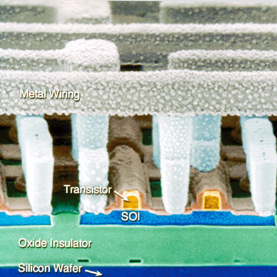 КНИ в чипе IBM (для наглядности пространство между проводниками вытравлено). Снизу вверх: подложка, оксид-изолятор, тонкий слой кремния, транзисторы и один слой металлических межсоединений.