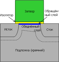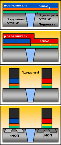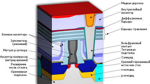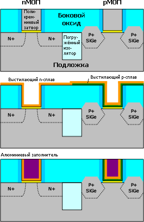 Устройство 45-нанометрового p-канального транзистора в микросхемах Intel. Тут не указано присутствие в затворе слоя металла для n-канального транзистора.