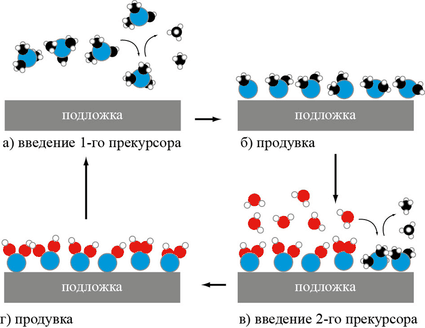 4 стадии цикла молекулярного наслаивания AlO2. Алюминий (синие атомы) поставляет 1-й прекурсор, валентные связи которого заняты лигандами (временными радикалами, в данном случае метильными группами —CH3). 1-я продувка удаляет метан (CH4) и избыток прекурсора. Вторым прекурсором является вода, замещающая остальные два лиганда у каждого атома Al. 2-я продувка удаляет лишнюю воду и метан. В следующем цикле атомы водорода 1-го слоя будут замещены связью с Al 2-го слоя, восстановив свободные метильные группы до метана.