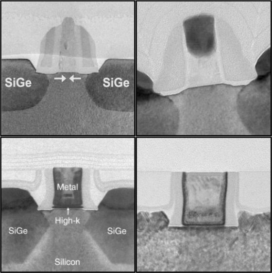 4 последних поколения транзисторов Intel (слева направо, сверху вниз) — 90 (2003 г., первое применение напряжённого кремния), 65 (2005), 45 (2007, первое применение комбинации HKMG) и 32 (2009) нм.