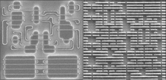 65-нанометровые транзисторы (слева) могли себе позволить такие роскошества как двунаправленные дорожки (вертикали и горизонтали) и переменные размеры затворов и их шагов. Для 32-нанометрового техпроцесса (справа) всё это запрещено.