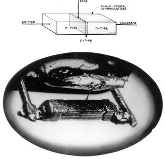 Правда, оба прибора были с неудобным в производстве точечным контактом к полупроводнику. В 1951 г. Шокли изобрёл биполярный транзистор с двумя p-n-переходами, полностью заменивший точечные уже к середине 50-х. К 1954 г. транзисторы уже стали обязательными компонентами в телефонных станциях и аппаратах фирмы Bell. Мудрейшим шагом компании было решение 1952 г. о продаже (за 25000 долларов) лицензий на выпуск биполярных транзисторов 26 другим фирмам. Уже через 2 года появились транзисторные радиоприёмники, на время ставшие сутью самого слова «транзистор» в массовом сознании. В 1956 г. за открытие транзисторного эффекта Уильям Шокли и его помощники Джон Бэрдин и Уолтер Брэттэйн получили нобелевскую премию по физике.