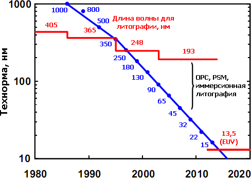До 90-х гг. фотолитография использовала ртутные газоразрядные лампы, отсекая из их света всё, кроме нужной частоты, совпадающей с одним из пиков («линий») — G (436 нм), H (405) или I (365). После того, как мощности ламп стало не хватать для требуемой производительности, потребовалось внедрить эксимерный лазер, что сделали в 1982 г. в IBM (сам такой лазер изобретён в СССР в 1971 г.). В зависимости от газа он даёт длину волны 248 (KrF), 193 (ArF) и 157 нм (F2). От фторовых лазеров, правда, отказались из-за чрезвычайных технических проблем, решение которых не окупится преимуществами — дело в том, что сам воздух начинает поглощать излучение с длиной волны меньше 186 нм, так что весь литограф надо переделать под вакуум. Это его усложняет и удорожает с 40 до 50 млн. долларов, а сканеров фабу требуется несколько. Поэтому даже самые современные техпроцессы с технормами менее 30 нм всё ещё используют аргон-фторовый лазер. При этом переход на так называемый экстремальный ультрафиолет (ЭУФ, EUV) с длинами волн 13,5 нм и менее рано или поздно всё равно состоится — и без вакуума тут точно не обойтись.