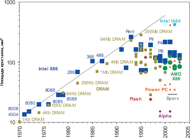 Площади кристаллов наиболее сложных микросхем процессоров и памяти на указанный год. В 1990-е годы тенденция увеличения площади на 14% в год (чёрная линия) остановлена. Впрочем, самые сложные кристаллы ГП и серверных ЦП достигают 400–500 мм², но и эта цифра не растёт уже лет пять, хотя почти все производители уже успели с 90-х перейти на 300-миллиметровые пластины, позволяющие производить с той же массовостью и ценой даже такие большие кристаллы.