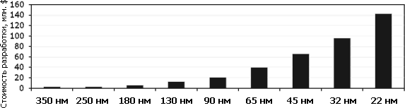 В итоге окажется, что даже не допуская ни одной ошибки в рыночной стратегии, мы окупим нашу микросхему, лишь рассчитывая на производство и сбыт устройств с ней миллионами, иначе её никто не купит из-за цены. Недавно сотрудник компании Cadence (выпускающей специализированные САПРы для разработки микросхем) рассказал, что стоимость перехода с 32–28 на 22–20 нм сильно выросла по сравнению с предыдущими шагами. Микроэлектронные компании инвестировали в НИОКР по 32–28 нм 1,2 млрд. долларов и 2–3 млрд. для 22–20 нм. Проектирование чипа стоит 50–90 млн. долларов для 32 нм и 120–500 млн. долларов для 22 нм. Компенсация затрат на разработку и производство потребует продать 30–40 млн. 32-нанометровых кристаллов и 60–100 млн. на 20 нм.