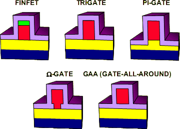 Помимо FinFET’ов, Intel рассматривала ещё 4 варианта новых видов транзисторов, но по разным причинам они были отклонены. Например, технически самый совершенный GAA-транзистор с затвором, полностью окружённым изолятором, видимо, показался слишком дорогим или ненадёжным. Кроме того, т.к. странная зелёная «шапка» ни на каких других иллюстрациях больше не встречается и не видна на микрофотографиях, можно сделать вывод, что реализован вариант с 3-сторонним затвором типа Trigate.
