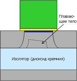 Уменьшить утечки можно технологией КНИ, в данном случае — частично обеднённой (Partially Depleted, PD SOI). Тут изолятор отсекает подложку, но остаточный слой под каналом («плавающее тело») всё ещё приводит к утечкам, хоть и не таким большим. Эта технология широко используется прежде всего из-за относительной дешевизны.