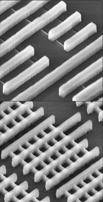 Расскажем и о двух любопытных техниках, применяемых лишь некоторыми компаниями. Впрочем, первая известна с начала 2000-х и в какой-либо форме применяется во всех современных сканерах — структурный свет (structured light), меняющий форму луча лазера. Его сечение при этом оказывается не круглым, а кольцевым, 4-полюсным или каким-то ещё. Однако в 2009 г. Toshiba и NEC использовали в своём 32-нанометровом процессе новый вид такого освещения (возможно, в комплексе с доводкой методов OPC под него), что позволило обойтись без дорогостоящего двойного структурирования (которое у этих фирм вызвало 25-процентное увеличение дефектности). Обычно на таких размерах одно экспонирование единственной маски на слой приводит к сильным искажениям прямых дорожек (не смотря на OPC). Но структурный свет решает эту проблему и даже позволяет уменьшить шаг между элементами. Поэтому у Toshiba и NEC получилась самая маленькая (среди 32-нанометровых процессов всех фирм) ячейка СОЗУ — на 0,124 мк² (позже мы сравним эти цифры детальней), а плотность транзисторов в логике — 3,65 млн. вентилей/мм². И всё это по вдвое меньшей удельной цене, чем для своих же 45 нм, и на 9% дешевле, чем с применением двойного структурирования. Учись, Intel :)