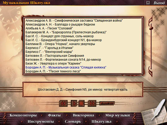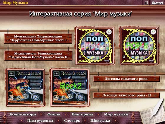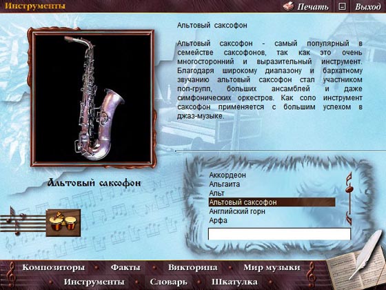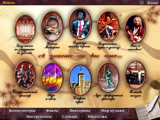 Уникальная мультимедийная музыкальная энциклопедия. В ней вы найдете: статьи, аудио- и видео-фрагменты, рассказывающие о жизни и творчестве более ста великих композиторов, энциклопедию старинных и современных инструментов, интересные и малоизвестные факты из жизни великих музыкантов, словарь музыкальных терминов, увлекательную музыкальную викторину.