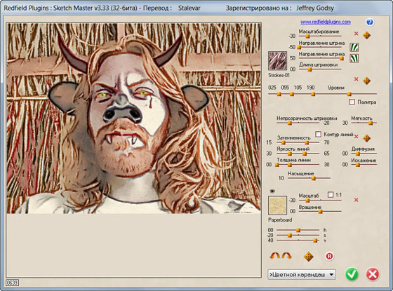 Sketch Master - плагин для Adobe Photoshop позволяющий создать реалистические "ручные" рисунки, полученные из фотографий. Вы можете моделировать различные инструменты, типа графитового карандаша,чернил, мелка, древесного угля, распылителя краски, и т.д. Три слоя с отдельными параметрами настроек позволяют производить некоторые эффекты стилизованных искусств на всех видах поверхностей (водная бумага, бумага в клетку, газета, холст, кожа, креп, тряпка или любой другой вид поверхности, который вы желаете).