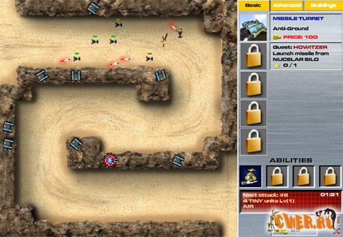 Флешка из серии легендарных "башен". Ваша задача оборонять территорию, не давая врагу пересечь её из начала в конец. В Вашем распоряжении разнообразное стационарное оружие(пушки, ракеты, лазеры и т.д.). За уничтоженные боевые единицы противника Вам платят деньги, на которые можно купить новое оружие(модернизировать уже имеющееся) или разнообразную "недвижимость".