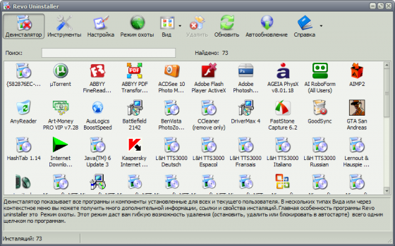 Revo Uninstaller - бесплатная утилита, которая является не просто очередным аналогом стандартного апплета "Установка и удаление программ" операционных систем Windows, а объединяет в себе достаточное количество полезных модулей и компонент для выполнения полномасштабной очистки компьютера. Revo Uninstaller работает эффективнее стандартных средств Windows, благодаря тому, что до и после деинсталляции проводит сканирование системы, обнаруживая и удаляя все внесенные удаляемой программой изменения (файлы, папки, ключи реестра).