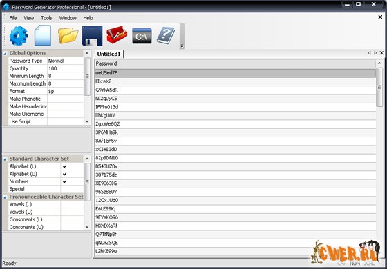 Программа быстро генерирует до 10 миллионов уникальных паролей, ников и логинов за один сеанс пятью различными, полностью случайными способами: 1 - автоматической генерацией (цифры, буквы, специальные знаки); 2 - с помощью заданной маски образов; 3 - словарным методом из специфического файла, текста; 4 - легко запоминающиеся ники, логины и так называемые "мастер пароли" и 5 - микс всех способов. Осуществляет сверку на отсутствие слова в словаре и не допускает дубликатов. Экспорт списка паролей осуществляется в форматах TXT, CSV, HTML или MS-Access® database (MDB).