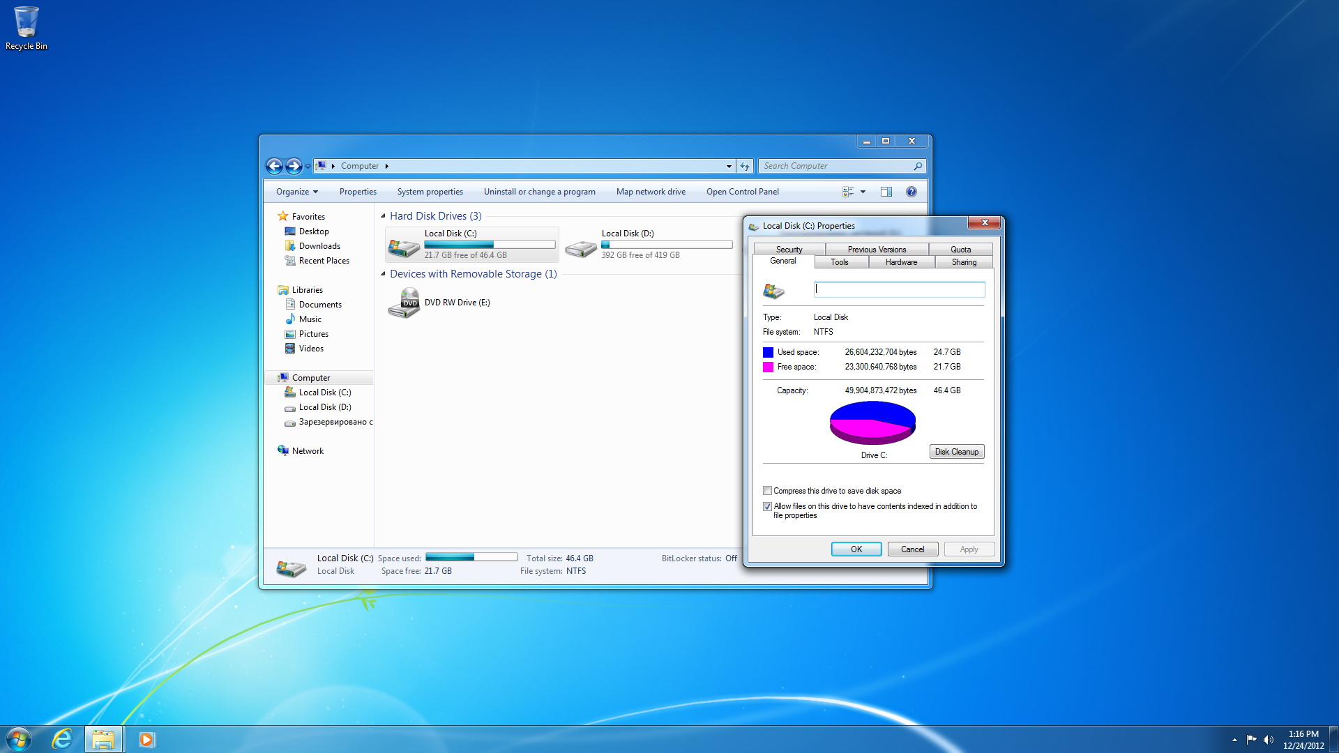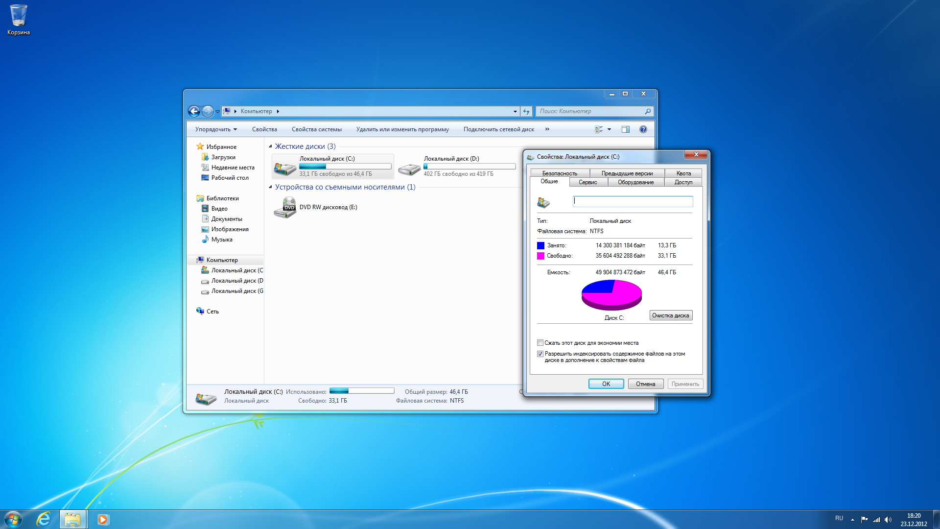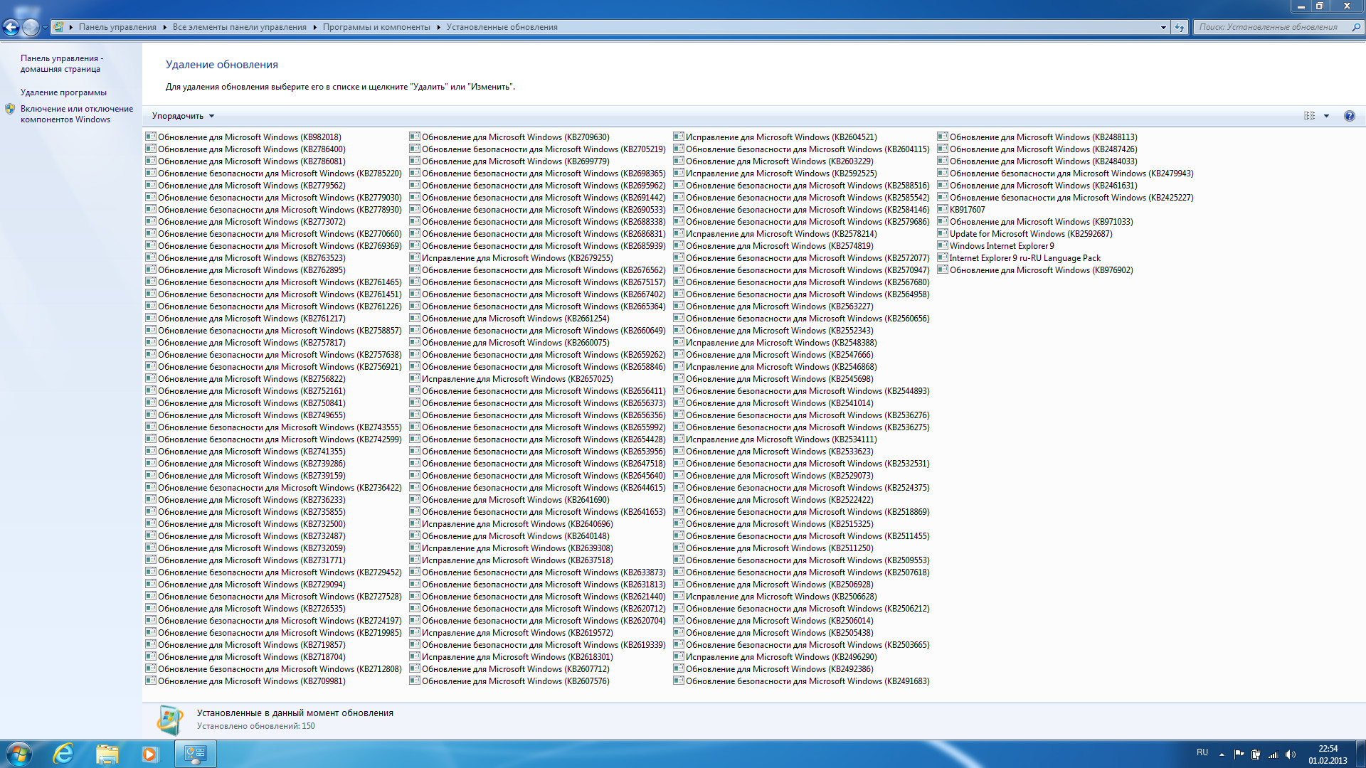 Выбор языка Рабочий стол Свойства диска Установленные обновления Internet Explorer