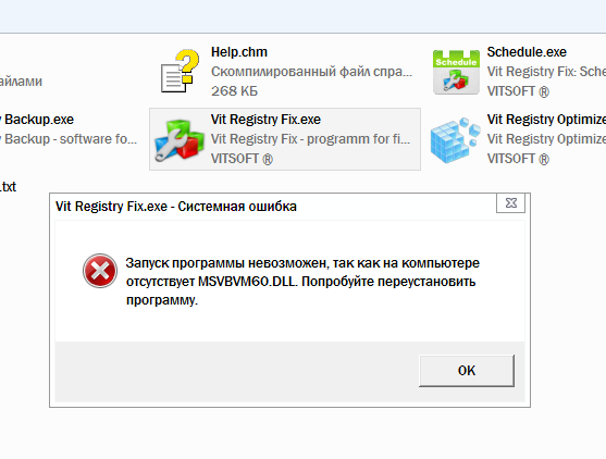 Запуск программы невозможен, так как на компьютере отсутствует MSVBVM60.DLL. Попробуйте переустановить программу.