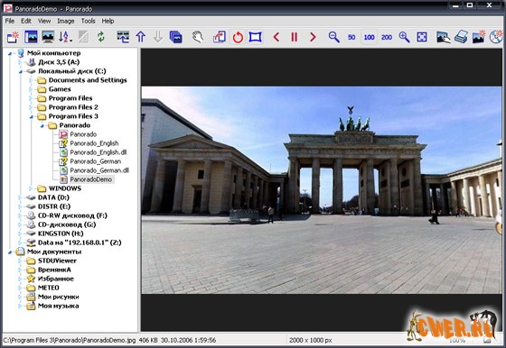 Panorado - это простой и удобный просмотрщик изображений, который был специально разработан для просмотра больших и панорамных изображений. Комфортный просмотр при помощи простых перемещений мыши или нажатия на её 5 кнопок (у кого они есть :)). Panorado автоматически распознает 360°-ную склейку и отобразит её без шва - в зацикленном просмотре. Поддержка 14-ти графических форматов: JPEG, GIF, BMP, WMF, EMF, ICO, CUR, TGA, PCX, PNG, TIFF, JPEG 2000, PNM, и RAS. В версии 3.0 добавилась поддержка формата QuickTime.