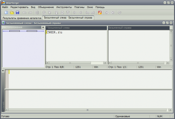 WinMerge - программа для визуального сравнения текстовых документов в Windows на предмет изменений в них. WinMerge умеет работать с DOS, UNIX и MAC форматами файлов, поддерживает Unicode и имеет подсветку синтаксиса. Может оказаться очень полезной, например, для определения того, что изменилось в одной версии проекта по сравнению с другой, а также для слияния изменений, выполненных в различных версиях. Кроме того, есть специальная панель для навигации по документу, при помощи которой можно быстро перемещаться к тем фрагментам файла, где есть отличия. Сравнение файлов можно выполнять с учетом регулярных выражений.