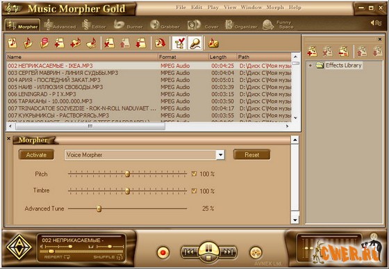 Кроме того, AV Music Morpher Gold 3.0 содержит новый Voice Extractor и Voice Remover с улучшенными алгоритмами для разделения голоса певца и музыки в песне. Music Morpher Gold включает программу записи MP3 и устройство автоматической смены дисков. В отличие от других MP3 проигрывателей, таких как Winamp, MusicMatch, RealPlayer или Windows Media Player, Music Morpher Gold может проигрывать и изменять музыку в режиме реального времени. Смеситель эффектов и библиотека эффектов разработаны для ваших разнообразных вкусов. Этот комплект инструментов также работает как MP3 конвертер, очень полезный в преобразовании MP3 в WAV, WMA или в любой из 10 поддерживаемых форматов музыки. Music Morpher Gold an easy CD creator поставляется с: CD ripper для записи звуковых дорожек на жесткий диск, устройством записи для записи аудио компакт-диска, компакт-диск с данными и DVD данными, дизайнером обложек для проектирования обложек для компакт-дисков и DVD. Мультиформатный аудиопроигрыватель поддерживает форматы MP3, MP2, WMA, WAV, APE, OGG, AU, IRC. Это - лучший выбор для запуска дорожек в различных форматах, особенно музыки, загруженной из различных file sharing систем, таких как Kazaa, iMesh, eMusic, Napster, and Music Net. Music Morpher Gold совместим с караоке. Music Morpher Gold идеально подходит для оперативной трансформации музыки, смешивания музыки, создания заказного CD, караоке CD, звуковой дорожки и аудио клипов.
