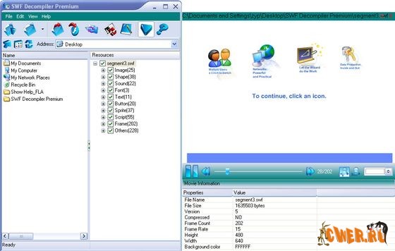 Данная программа позволяет экспортировать Fla-данные, которые можно легко редактировать в родной среде Flash и конвертировать между .swf и .exe форматами. Все компоненты - изображения, звуки, скрипты, тексты, формы, фреймы, шрифты, кнопки и спрайты будут полностью экспортированы. Программа поделена на две части - в первой части Вы выполняете все операции с файлами (открытие, редактирование и многое другое), во второй половине проигрыватель, с помощью которого Вы сможете просмотреть не только flash-ролик, но и другие компоненты flash (картинки, звуки, шрифты, формы и т.д.), что довольно удобно при работе.
