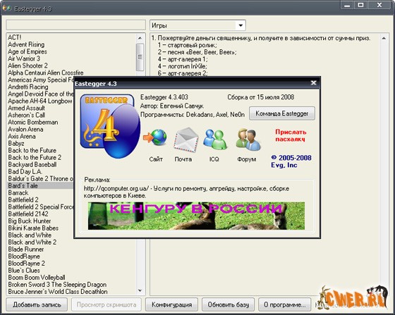 Известно, что у каждого есть свои секреты, это знают все. Вот и у каждой программы есть свои секреты. Eastegger здесь не исключение ;-). Эта программа содержит базу данных с описаниями пасхальных яиц (скрытых возможностей в программах), которые разработчики часто скрывают в своих творениях. В ней имеются секреты к большому числу программ, операционным системам, играм, мобильным телефонам, карманным компьютерам и с каждой новой версией этот список расширяется. База обновляется ежемесячно.
